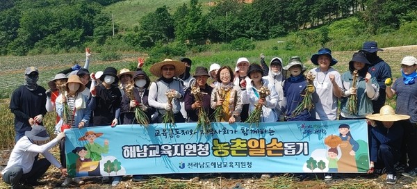 해남교육지원청(교육장 이자영) 직원 40여명은 지난 5월24일 일손 부족으로 어려움을 겪고 있는 화산면의 농가를 방문해 마늘 수확 및 주변 환경 정비 작업을 지원했다.