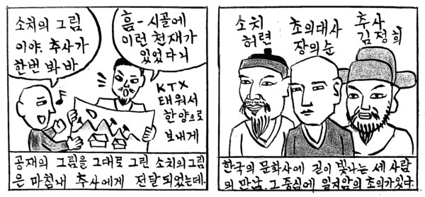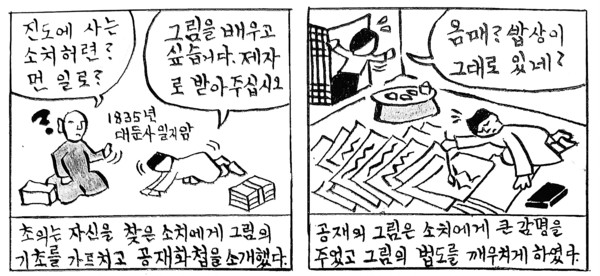 초의가 보낸 허련의 그림을 본 추사는 깜짝 놀란다. “이같이 뛰어난 인재를 어찌 손잡고 함께 오지 못했소? 만약 서울에 와서 있게 되면 그 진보는 측량할 수 없을 것이오. 즉각 서울로 올라오도록 하시오(如此絶才 何不携手同來 若使來遊京洛 其進不可量也 卽圖京行).”