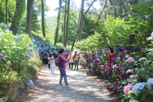 수국이 아름다운 현산면 포레스트수목원에 전국에서 수국축제를 즐기러 온 인파로 가득하다. 관광객들은 알록달록 수국 앞에서 기념사진을 찍는데 여념이 없다. 수국 만개는 6월20일 전후로 이번 주말 탐스러운 수국이 절정이다.