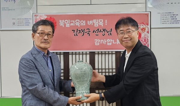 북일초등학교 김을용 교장이 지난 6월20일 오랜 기간 북일초에 장학금을 기탁한 독지가 김재국씨에게 감사한 마음을 전했다.