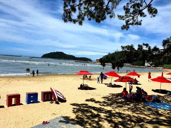 특히 모래가 곱고 수심이 얕아 가족들이 함께하기 좋으며 해송이 제방을 따라 이어져 있어 야영을 하기에도 적합하다.