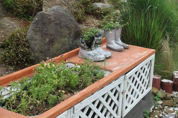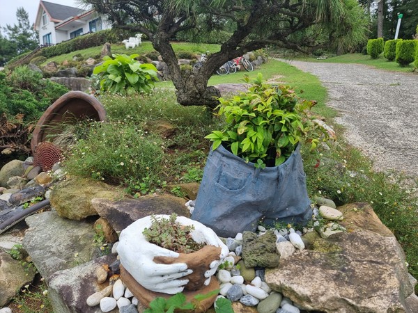 부표 스티로폼을 조각해 양파망을 감고 시멘트를 발라 화분, 곰돌이, 양 등 다양한 볼거리를 만들었다. 버릴 것이 하나도 없다는 그의 손에서 폐자전거나 장화, 싱크대, 휠체어, 청바지도 모두 작품으로 재탄생돼 정원에 볼거리를 더한다. 또 건강을 생각해 황톳길도 만들었다.