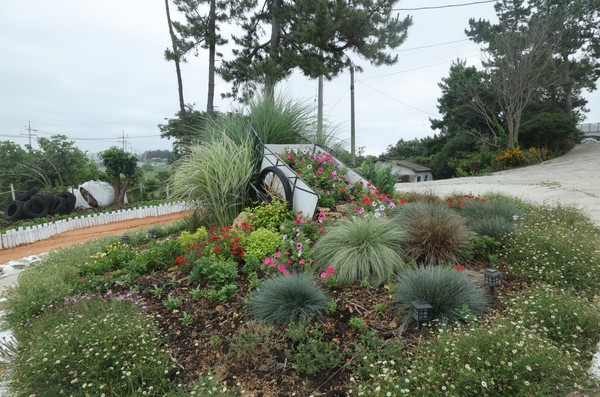 정원에 있는 조형물도 바다에 떠밀려온 부표나 폐자재를 활용해 직접 업사이클링한 것들이다.