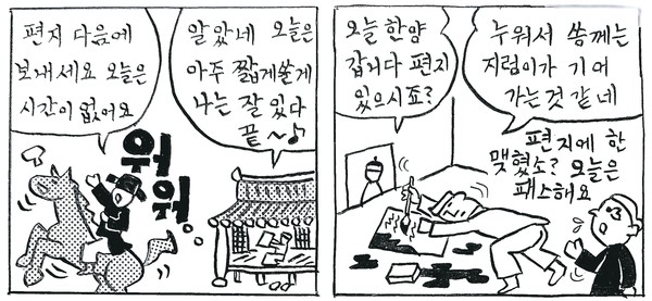 하직인사를 하고 떠나는 사람을 말 위에서 기다리게 하고 편지를 쓰기도 한다. 몇 자만 쓸게. 마당쇠야 지필묵 가져와라. 서두르는 모습을 상상해보라. 편지를 대하는 윤이후의 생각이 담겨있는 글을 소개한다.