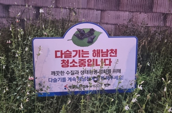 해남읍 중심을 관통하는 해남천은 바닥이 까말 정도로 다슬기 풍년이다. 깨끗한 물에만 서식하는 다슬기는 수질을 정화하는데도 탁월한 역할을 한다고 한다. 이로 인해 해남천의 수질은 더 깨끗해지고 있는데, 이런 다슬기마저 잡아가는 일이 일어나자 해남군이 고민 끝에 내 놓은 것이 안내표지판.