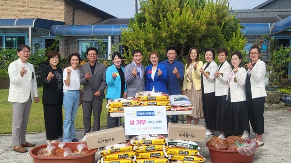 해남목련클럽 이해심 대표가 지난 6월12일 황산 소망요양원(원장 이현옥)에 쌀 200kg과 김장김치 200kg, 누룽지와 물티슈를 들고 찾았다.
