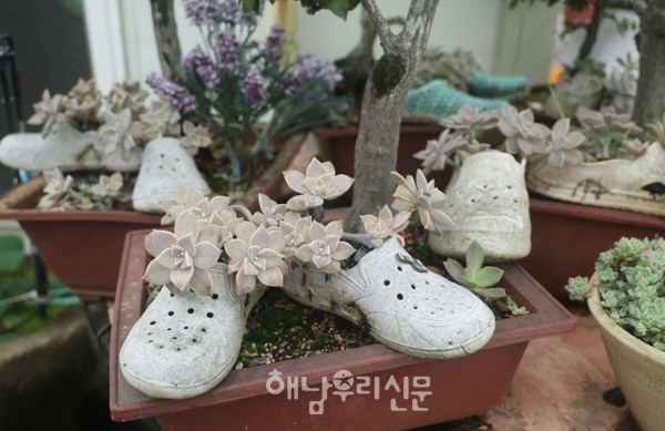 북일면 흥촌리 북일초등학교 입구 길가엔 화분으로 만든 정원이 있다. 가던 길을 멈추고 화분정원 안을 들여다보면 아기자기한 화분과 나무들이 볼만하다. 그중 다육식물 신발화분이 눈에 띈다.