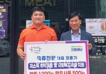 육류천왕(대표 정훈기)은 지난 8월2일 어려운 이웃과 사회복지시설에 전해 달라며 한돈 1,000kg과 한우사골뼈 500㎏을 해남군에 기탁했다. 이날 기탁받은 한돈은 저소득 취약계층 81가구와 사회복지시설 61개소에 전달됐다. 육류천왕은 지역사회를 위해 매년 한돈나눔, 이웃돕기 성금 기탁 등 다양한 나눔 활동을 이어오고 있다.