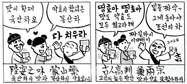 “조선에서 나는 차는 원래 중국차와 서로 같아서, 색ㆍ향ㆍ기운ㆍ맛을 의논하면 한 가지라네. 육안차의 맛과 몽산차의 약효를 모두 갖추었으니, 옛사람은 높은 판단으로 겸해서 둘 다 으뜸이라 했구나.” 동국소산원상동(東國所產元相同) 색향기미론일공(色香氣味論一功) 육안지미몽산약(陸安之味蒙山藥) 고인고판겸양종(古人高判兼兩宗).