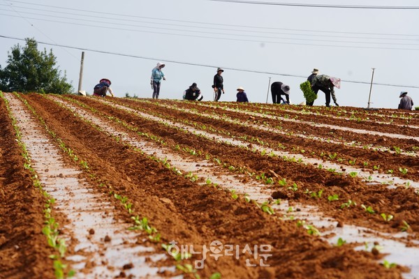 산이면 강병일 농가의 황토들녘에서 가을배추정식이 한창이다. 9월초 정식하는 가을배추는 10월 말부터 수확하는 김장배추이다. 겨울배추는 9월 중순까지 정식을 마치고, 겨울철 월동 후 12월부터 수확한다. 해남배추는 황토땅에서 해풍을 맞고 자라 미네랄 등 영양이 풍부하고, 단단하고 꽉차게 여문 노란 속이 특징이어서 ‘명품 배추’로 통하고 있다.