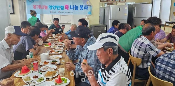 해남군 자원봉사센터와 자원봉사 단체는 영양가득 죽나눔 봉사활동을 지난 8월20일 삼산면 원진마을, 21일 북평면 와룡마을, 22일 송지면 미야마을, 23일 해남읍 수성2마을, 27일 북일면 월성마을에서 진행했다. 죽 나눔행사는 해남형 ESG실천을 위해 1회용품이 아닌 다회용 식기를 사용했다.