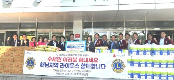 국제라이온스해남지역클럽은 지난 8월28일 수해로 피해를 입은 수재민들에게 전달해 달라며 400만원 상당 생활물품을 기탁했다. 기탁식에는 심자선 총재와 양옥년 전의장을 비롯한 지구총당단, 지역위원장과 해남지역 지대위원장, 회장단들이 참석했다.
