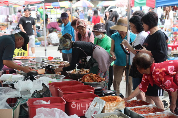 추석을 앞둔 지난 9월11일, 해남오일장이 모처럼 붐볐다. 인구 감소로 행사장 외엔 운집된 사람들을 보기 힘든 농촌에서 오일장의 풍경은 생소한 생기다. 해남오일장 반찬가게, 시대변화를 보여주듯 할머니들도 반찬가게 앞에서 발을 멈춘다.