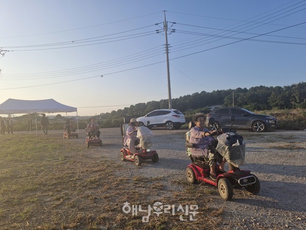 지난 9월8일 황산면 연호리 수제맥주 공방 마당에서 열린 우리쌀 수제맥주 출시 기념, 윈디시티×이박사 공연을 찾은 할머니들, 요즘 것들은 어떻게 노는가 궁금한 연호마을 할머니들이 전동차를 타고 나란히 나란히 공연장으로 들어서고 있다.