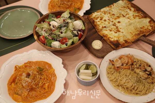 가격은 베이컨크림파스타 15,000원, 쉬림프 오일 파스타 16,000원, 부채살 스테이크 27,000원, 볶음밥 17,000원, 루꼴라 피자 16,000원, 감바스 17,000원, 리코타 샐러드 13,000원 등이다. 다양한 메뉴와 와인이 준비돼 있으며, 콜키지도 가능하다.