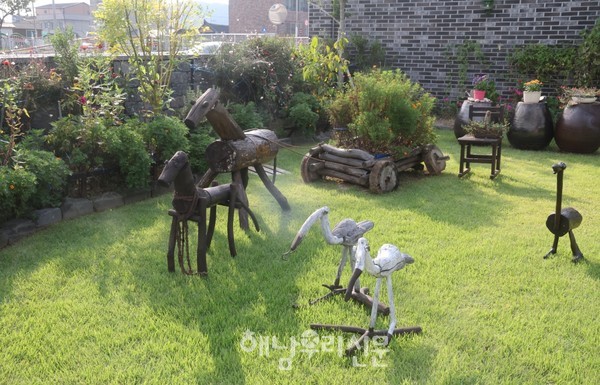 남편이 조형물을 담당했다면, 마당의 꽃은 철저히 아내 박형란씨의 영역이다. 어릴 적부터 꽃을 참 좋아했다는 박형란씨는 서정적인 꽃들을 특히 좋아한다. 봄부터 다양한 꽃이 정원에 피기 시작하는데, 손수 씨앗을 뿌려 포트를 만들고, 삽목해서 심은 것들이다. 잔디도 지인의 정원 모퉁이에서 가져와 조금씩 떼어 심은 것이 지금의 잔디밭을 형성했다.