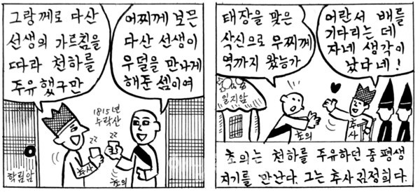 다산은 큰 스승이었다. 초의에게 학문과 시문을 가르치는데 그치지 않았다. “사방을 구름처럼 노닐면서 나라 안의 이름난 산을 두루 보고 나라 안의 이름난 선비를 다 알아야 한다”고 주문했다. 운유사방(雲游四方) 진관국중명산(盡觀國中名山) 진식국중명사(盡識國中名士).