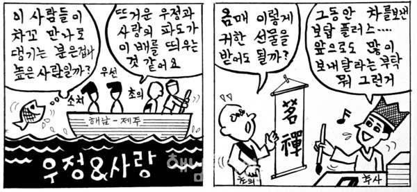 추사가 제주에서 9년을 보내는 동안 초의는 세 번이나 친구를 찾아간다. 산방굴사에 6개월을 머물면서 날마다 추사를 위로하기도 하였다. 초의만이 아니었다. 소치 허련, 세한도를 탄생시킨 우선 이상적도 추사를 찾는다. 생명을 기약할 길 없는 바다 위에 배를 띄운 우정과 사랑이 눈물겹다.