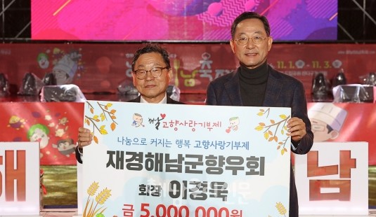 재경해남군향우회 이경욱 회장은 화산면 출신으로 고향을 사랑하는 마음으로 500만원을 기부했다.
