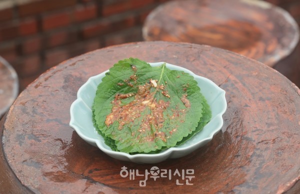 그는 이번 미남축제 때 깻잎 된장김치를 선보였다, 친정어머니가 자주 해줬던 반찬인데 된장에 양파, 통깨, 고춧가루, 참기름 등 양념으로 무친 친정엄마표 깻잎 반찬이다. 여기에 사과와 배를 넣어 자신만의 깻잎된장 반찬을 완성했다.