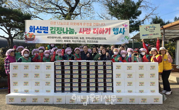 화산면 새마을부녀회를 비롯한 10개 기관·사회단체가 지난 12월3일 김장나눔 사랑더하기 행사를 진행했다. 이날 담근 김장은 경로당 49개소와 독거어르신 댁에 직접 전달됐다. 명순미 새마을부녀회장은 “이번 김장나눔 행사가 나눔 문화를 더욱 확산하는 계기가 되었길 바란다”고 말했다.