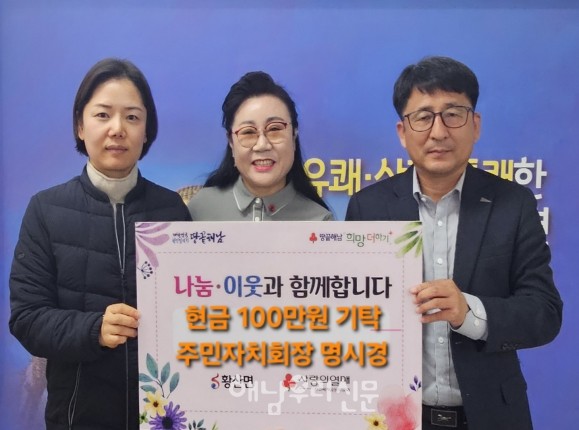 황산면주민자치회 명시경 회장이 지난 12월9일 현금 100만원을 황산면에 기탁했다. 명 회장은 지난 8년간 해남군장교육재단과 황산면에 매년 후원금을 전달하고 있는데, 올해는 지역에 의료비 지원을 받지 못하는 중증 환자를 위해 써 달라며 현금을 기탁했다.