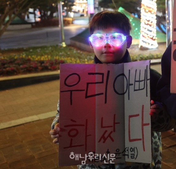 지난 12월11일 윤석열 탄핵 해남군민 문화제에 참여한 어린이의 피켓이 우리아빠 화났단다. 이날 문화제에는 학생들과 어린이들, 학부모의 참여가 많았다. 해남우리신문 webmaster@hnwoori.com 다른기사 보기 저작권자 © 해남우리신문 무단전재 및 재배포 금지 당신만 안 본 뉴스 명찰보고 너 누구구나…55년 만에 재회 | 뿌리깊은 해남이야기 97 | 해남 땅이름 유래 (8) 북일면편 내년 지방선거, 도의원 선거구 바뀌나 곧 터질거라 했다… J프로젝트 관광도시 대통령도 움직였다 대대적인 노선 개편, 서부권 목포 구간 증설 요구 해남 청년들의 3중주 가을 음악회 가래떡·뻥튀기 나누며 우리쌀 소비운동 명찰보고 너 누구구나…55년 만에 재회 댓글삭제 삭제한 댓글은 다시 복구할 수 없습니다. 그래도 삭제하시겠습니까? 비밀번호 닫기 기사 댓글 0 댓글 접기 로그인 후 이용 가능합니다. 댓글 내용입력 비회원 로그인 이름 비밀번호 댓글 내용입력 댓글쓰기 계정을 선택하시면 로그인·계정인증을 통해 댓글을 남기실 수 있습니다. 회원 로그인 비회원 글쓰기 이름 비밀번호 자동등록방지 로그인 옵션 창닫기 주요기사 읍 공동화 막자…12월 초 민관협의체 발족 448억 태양광 패널 재처리시설, 국비 100% 해달라 대대적인 노선 개편, 서부권 목포 구간 증설 요구 이병연 유기농 명인, 햅쌀 500kg 기탁 나의 직책은 마을청년회장, 윤채현 전 교장 토요일에 땅끝 오세요…흥겨운 음악에 수산물 직거래 장터
