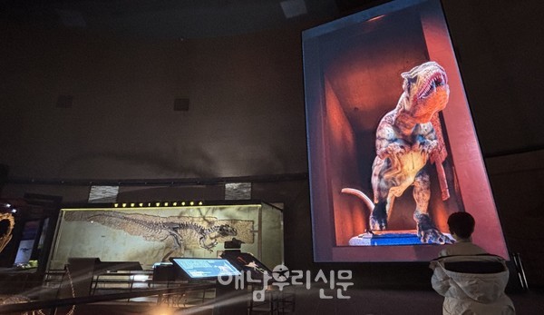 해남공룡박물관 지하 1층 벽에 포효하는 알로사우루스 영상이 어린이들뿐 아니라 어른들에게도 흥미를 준다. 편당 5분 내외의 디지털 영상 3편이 관람객들을 알로사우루스가 살았던 공룡시대로 이끈다.