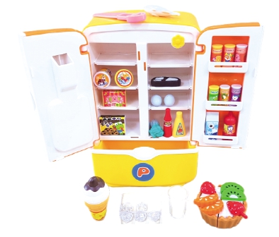 모형으로 된 음식을 냉장고에 넣었다 뺐다