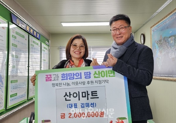 산이면 산이마트(대표 김미선)가 지난 12월19일 산이면에 지정기탁금 200만원을 기탁했다. 김미선 대표는 수년간 연말에 기부행위를 실천해오고 있다. 김 대표는 “이번 기부는 추운 겨울에 어려움에 처한 이웃들에게 도움이 되길 바라는 마음으로 진행하게 됐다”고 말했다.
