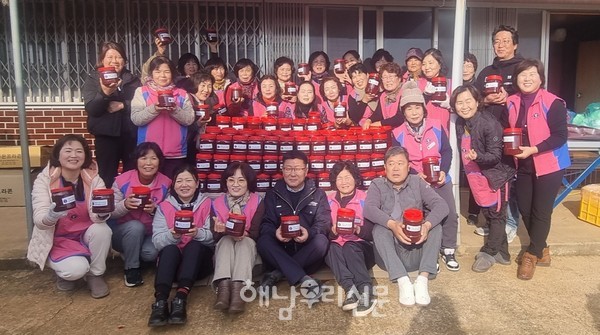 산이면 생활개선회(회장 김희자) 회원 40여명은 지난 12월18일 회원들이 직접 재배한 고추, 콩, 찹쌀 등으로 만든 고추장을 산이면 경로당과 조손가정 100가구에 전달했다. 이 활동은 2017년부터 이어오고 있다.