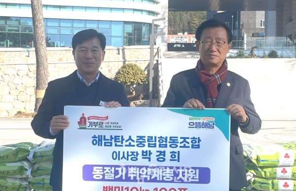 탄소중립협동조합(이사장 박경희)이 지난 12월19일 백미(10㎏) 100포를 해남군에 기탁했다. 박경희 이사장은 “소외된 이웃에게 조금이나마 온정을 나누고자 회원들의 정성을 모아 기부하게 됐다”고 소감을 밝혔다.