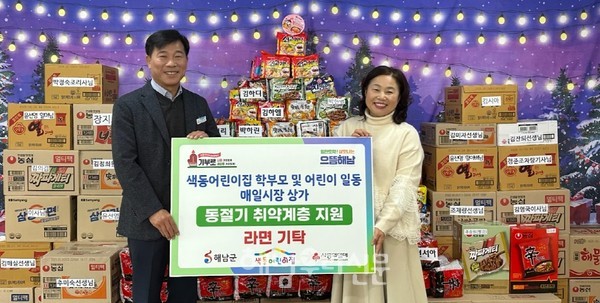 색동어린이집(원장 김정희) 학부모 및 어린이들과 매일시장 상가가 힘을 합쳐 지난 12월18일 해남군에 라면 40박스를 기탁했다. 김정희 원장은 “아이들이 직접 가져온 라면으로 기탁을 하게 돼 더욱 뜻깊다”고 전했다.