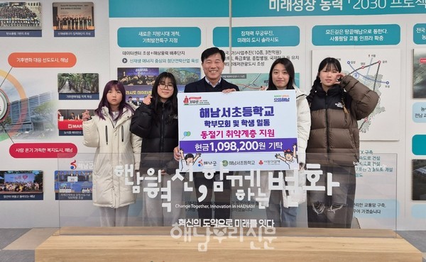 해남서초등학교 학생들과 학부모들이 지난 12월19일 바자회 수익금 전액인 1,098,200원을 해남군에 기탁했다. 해남서초는 매년 바자회 수익금을 해남군 취약계층을 위해 기탁해오고 있다, 해남서초 교사는 “아이들이 직접 나눔문화를 경험할 수 있는 좋은 기회다. 앞으로도 나눔을 실천할 수 있도록 지도하겠다”고 밝혔다.