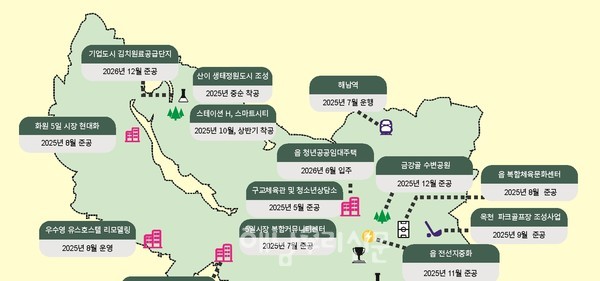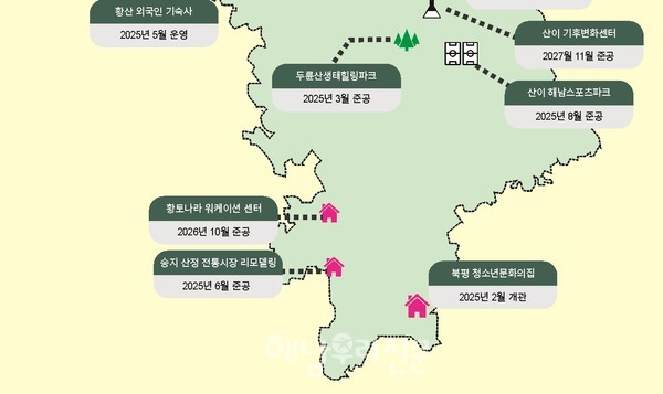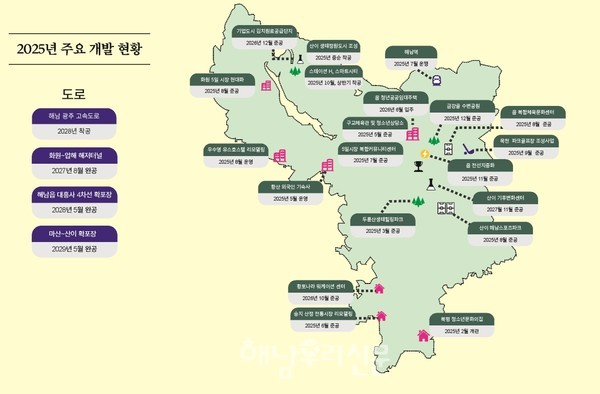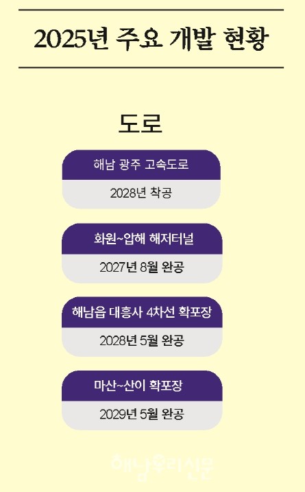 2025년도에도 해남군의 각종 인프라 구축사업은 계속된다. 신축 도로 및 확장, 건물, 사업 등을 정리했다. 김유성 기자 5340234@hanmail.net 다른기사 보기 저작권자 © 해남우리신문 무단전재 및 재배포 금지 당신만 안 본 뉴스 명찰보고 너 누구구나…55년 만에 재회 | 뿌리깊은 해남이야기 97 | 해남 땅이름 유래 (8) 북일면편 내년 지방선거, 도의원 선거구 바뀌나 곧 터질거라 했다… J프로젝트 관광도시 대통령도 움직였다 대대적인 노선 개편, 서부권 목포 구간 증설 요구 해남 청년들의 3중주 가을 음악회 가래떡·뻥튀기 나누며 우리쌀 소비운동 명찰보고 너 누구구나…55년 만에 재회 댓글삭제 삭제한 댓글은 다시 복구할 수 없습니다. 그래도 삭제하시겠습니까? 비밀번호 닫기 기사 댓글 0 댓글 접기 로그인 후 이용 가능합니다. 댓글 내용입력 비회원 로그인 이름 비밀번호 댓글 내용입력 댓글쓰기 계정을 선택하시면 로그인·계정인증을 통해 댓글을 남기실 수 있습니다. 회원 로그인 비회원 글쓰기 이름 비밀번호 자동등록방지 로그인 옵션 창닫기 주요기사 읍 공동화 막자…12월 초 민관협의체 발족 448억 태양광 패널 재처리시설, 국비 100% 해달라 대대적인 노선 개편, 서부권 목포 구간 증설 요구 이병연 유기농 명인, 햅쌀 500kg 기탁 나의 직책은 마을청년회장, 윤채현 전 교장 토요일에 땅끝 오세요…흥겨운 음악에 수산물 직거래 장터