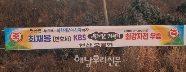 대한민국 퀴즈쇼 중 가장 난이도가 높다는 KBS 1TV ‘우리말 겨루기’ 그것도 이 프로그램이 시작된 2003년부터 2024년까지 달인에 등극한 이들까지 총출동한 최강자전에서 현산면 출신이 우승하자 새해부터 좋은 기운이라며 현산면이 활짝. 얼마나 좋은지 현수막까지 내걸며 다함께 우승을 축하.