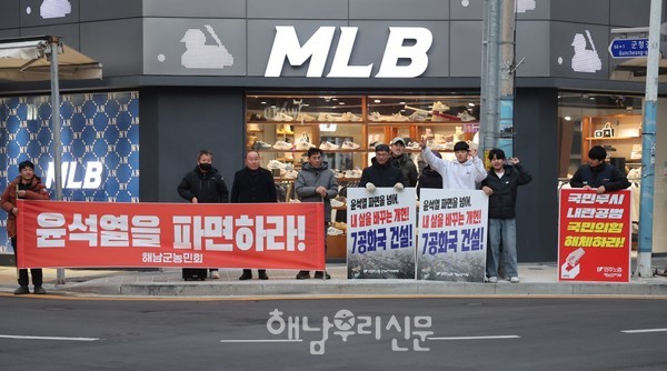 윤석열 대통령이 공수처에 체포된 다음날인 지난 1월16일 해남군농민회와 민주노총해남군지부, 해남군의회 이성옥 의장이 윤석열 파면과 국민의힘 해체를 요구하는 피켓시위를 구)광주은행 4사거리에 진행했다.
