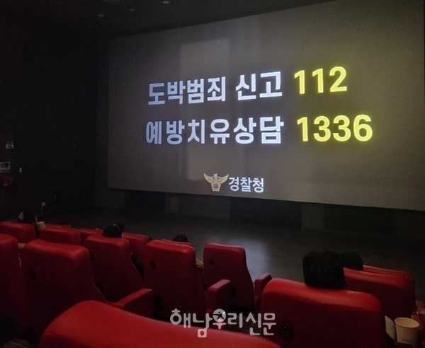 해남경찰서(서장 안형주)는 신학기 동안 청소년 사이버 도박 범죄 예방을 위해 해남시네마 영화 상영 전 경찰청 제작 ‘청소년 사이버 도박 범죄예방 숏폼 영상’을 송출하고 있다.