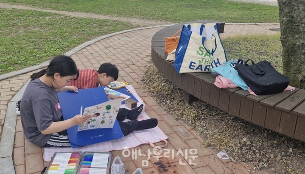 어린이들의 모습이 봄의 신록만큼이나 싱그럽고 자유롭다. 지난 4월19일 서림공원에서 열린 ‘제3회 어린이 환경 그림그리기 대회’, 해남의 공원 중 가장 오래된 공원에서, 노거수만이 울창한 공원에 활기가 더해졌다.