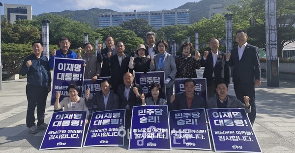 민주당 이재명 후보 당선을 위해 22일간 해남을 누볐던 민주당 선출직 의원들과 당직자들이 지난 6월4일 구 광주은행 사거리에서 감사의 거리 인사에 이어 해남군청 앞에서 서로를 격려하고 응원하며 거듭 군민들에게 감사를 전했다.