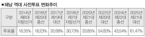 사전투표는 처음 도입된 2014년 지방선거에서 10%대로 출발해 2017년 대통령선거와 2018년 지방선거, 2020년 21대 총선에서 30%대까지 올라서더니 지난 제20대 대선에선 54.83%로 처음으로 50%대로 올라섰다. 이번 21대 대선에선 61.47%를 기록해 첫 60%대에 진입했다.