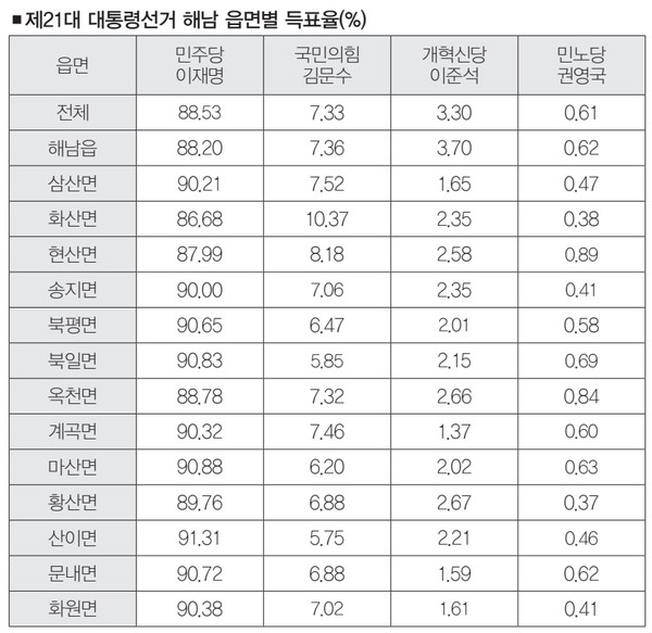 또 사전투표율이 높으면 진보진영이 유리하다는 판단과 본 선거 투표율을 견인해야 한다는 정서가 있어 호남에서의 사전투표율은 갈수록 높아지고 있다. 본 선거보다 더 중요하게 대두된 사전투표, 이번 대선에서도 해남군과 민주당은 사전투표 독려에 전 행정력과 조직력을 투입했다.