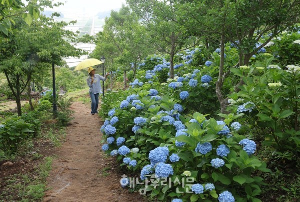 파란 수국이 탐스럽게 꽃을 피운 삼산면 비원에서 100만송이 수국축제가 6월20일부터 7월20일까지 열린다. 여름비를 맞은 수국이 연달아 개화하며 이후엔 초록의 목수국까지 이어진다.