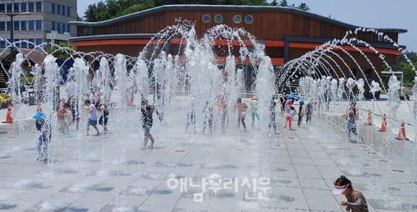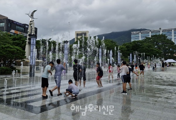 지난해 개장한 해남군청 군민광장 앞 음악분수도 여름철 빼놓을 수 없는 도심 속 물놀이 장소가 됐다. 어린이들이 물줄기를 가르며 뛰어놀고, 밤에는 조명과 음악이 어우러진 화려한 분수쇼가 펼쳐진다.