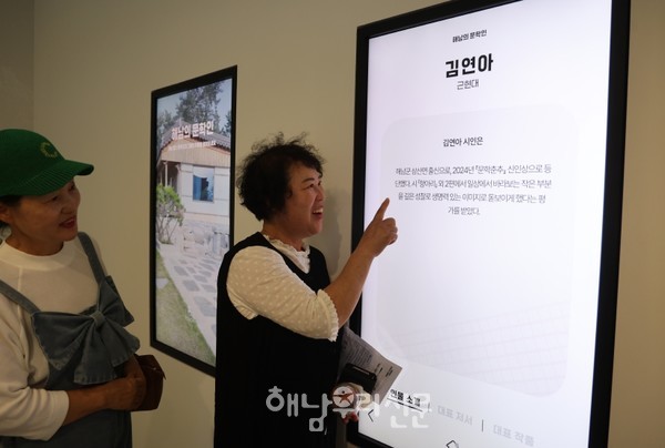 지난 7월4일 재개장한 땅끝순례문학관 전시실 터치패널에서 자신의 이름과 작품을 발견한 김연아 시인이 깜짝 놀라며 웃고 있다. 김연아 시인은 2024년 「문학춘추」 신인상으로 등단했다.