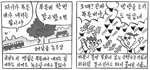 녹우당 툇마루에 앉아서 쓴 작품도 있다.
