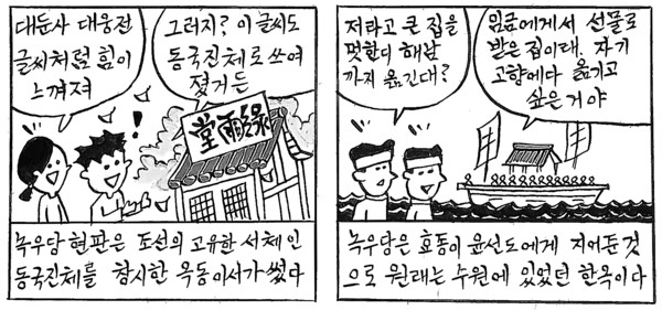 해남에 가면 녹우당(綠雨堂)이라는 한옥이 있다. 이 건물은 효종임금이 윤선도에게 하사한 사랑채다. 수원에 있던 것을 82세 때 고산이 해남으로 옮겨온 것이라 한다.