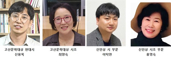 현대시는 최종심의에 오른 4권의 시집들 가운데 신용목의「우연한 미래에 우리가 있어서」(문학과지성사, 2024)를 고산문학대상으로 선정했다. 시조 부문은 본심의에 오른 4권의 시조집 중 최양숙의「종소리에는 마디가 있다」(고요아침, 2024)가 고산문학대상으로 선정됐다. 올해로 9회째를 맞고 있는 ‘고산문학대상 신인상’은 시부문 600여 편, 시조부문 400여 편의 응모작품 중 현대시 부문에서는 이탁연의「왜덕산타령」과 시조 부문에서는 홍영숙의「길 너머의 길」이 수상작으로 선정됐다.