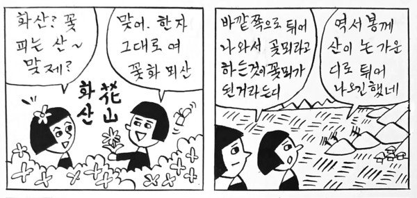 ▶화산, 꽃뫼 : 바다나 강 또는 들로 튀어나온 땅을 가리키는 우리 말 ‘곶’에서 유래. 튀어나온 산> 곶의뫼>꼬두뫼>꽃뫼 등으로 변화되고, 한자로 꽃 화(花), 뫼 산(山)을 쓴 것이다.