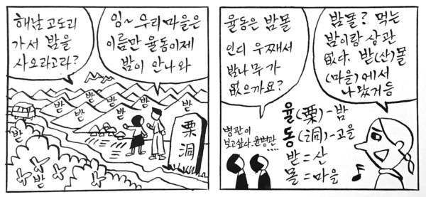 ▶율동 : 산마을. 산을 가리키는 우리말 ‘받’과 ‘마을’이 합쳐진 것이다. 산골짜기 마을>받몰>밤몰. 여기서 밤을 밤나무로 몰을 마을로 풀어서 율동(栗洞)이 된 것이다